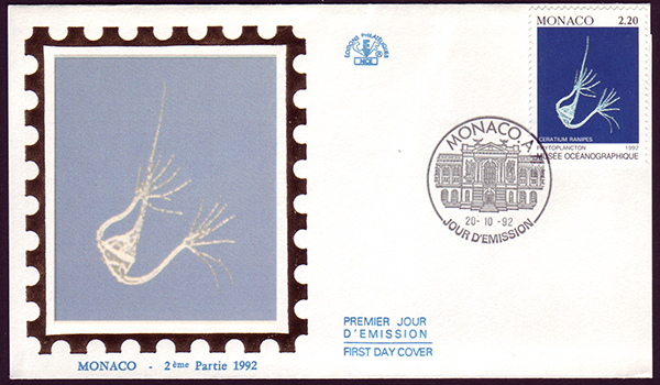 The two stamps and cachets show the dinoflagellates Ceratium ranipes and Ceratium hexacanthum.