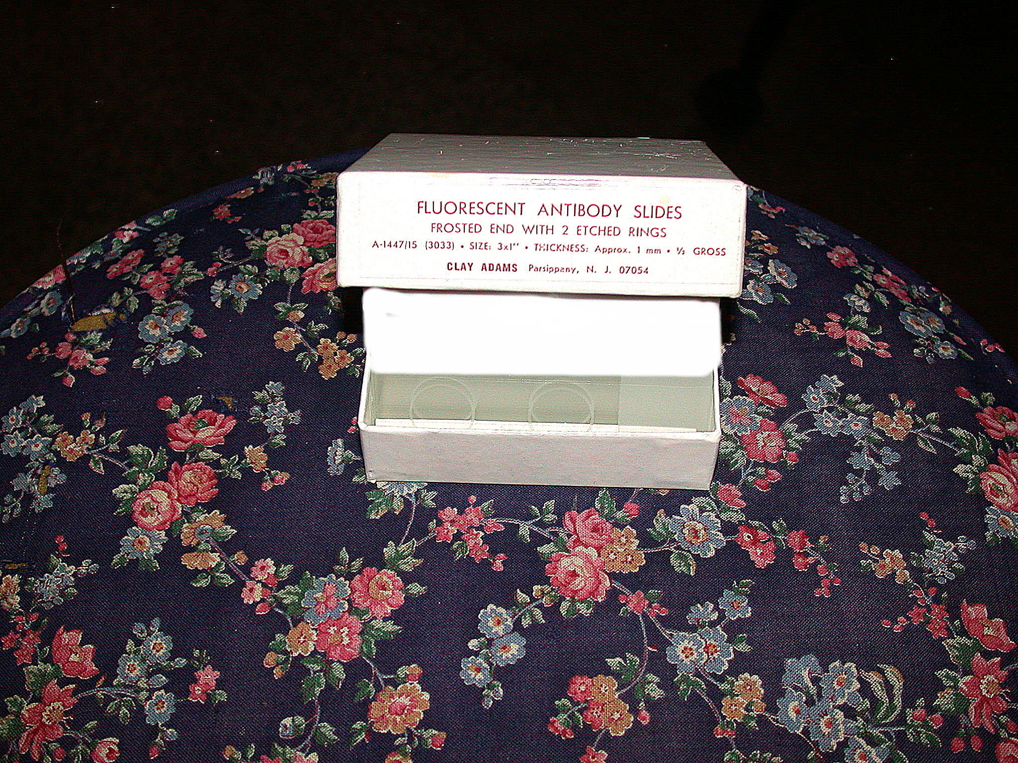 The other item which almost every microscopist has a constant need for is slides. At the same stockroom sale, I acquired a large number of boxes of standard slides. Some of these were of good quality and had frosted ends for labeling and slips of paper between the slides. Others were simply lumped together in the box and I use the word “lumped” advisedly for they had turned into a large clump of glass with all the slides stuck together. Now, they can be pried apart, but the process is tedious and frustrating, and unless one is very careful, one can get nasty cuts trying to separate them. If one undertakes such an operation, it’s best to wear goggles, thick laboratory gloves, and use a small, sturdy needle or spatula with a sharp end to separate them. A much better solution is to present them as presents to acquaintances that one doesn’t much like and let them toss the whole mess in the garbage. This particular box consisted of Fluorescent Antibody slides and each slide has two etched rings of about 20 mm.