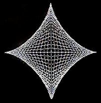 PROGRAMMES AND THEIR IMAGESIf you have trouble with writing or running the 3 programmes, send me an e-mail request and I will send the files to you as attachments. The files will only work on Qbasic and require translation into other basic languages. Do try manipulating the co-ordinates and stepping values and see what shapes and orientations you can create. Note that the 'G loop' is only inserted to slow down development in order to enjoy the image creation: It is not essential. I have pared the language down to a minimum for rapid results. The images are low resolution digital photographs from the screen.