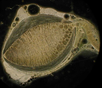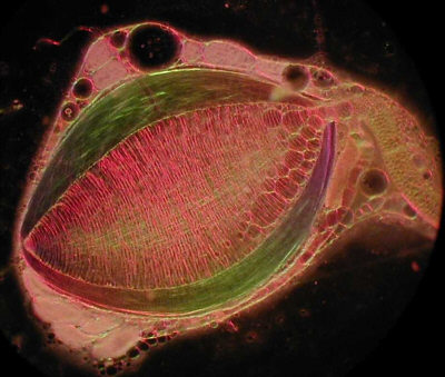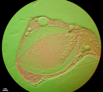 The images shown below are all of the same slide; a venom gland from a parasitic wasp. The same specimen was used so as to allow easier comparison of the different forms of illumination tried i.e. brightfield, darkfield, oblique, Rheinberg and oblique Rheinberg. I used my $95 second-hand American Optical 'scope and home-made darkfield/Rheinberg stops. An Olympus D-360L digital camera was used to snap the photos.To make the oblique Rheinberg effect, I simply off-centered the stop. The effect can be varied by simply adjusting the position of the stop with respect to the optical axis. I've found it simpler to use stick-on black central stops which I pasted onto ordinary microscope slides. The slides were attached to the bottom of the condenser using a bit of Blu-Tak adhesive instead of using the filter holder, which on my AO Spencer student scope is a bit awkward because it's not a swing-out type holder.