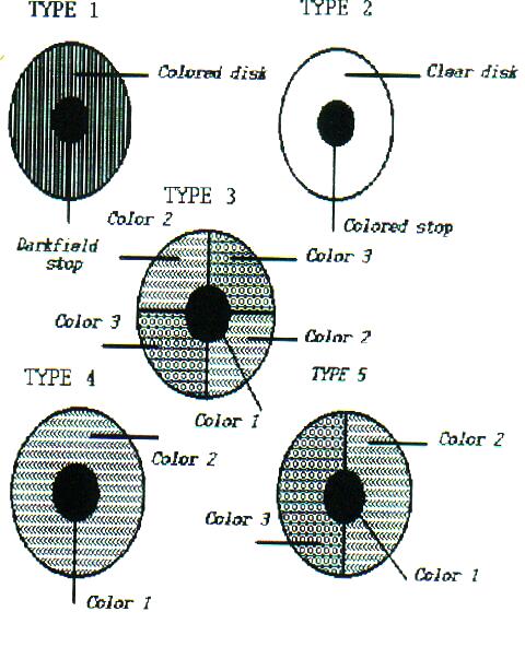 The accompanying diagram [See Figure 1] shows the most common sorts of Rheinberg filter configurations. As you change objectives, you will need to experiment with different sizes of center stops (either black or colored) and I do strongly urge you to experiment with this technique. And, if you find some interesting wrinkle and get some interesting results, write them up and share it with all the Micscapers.