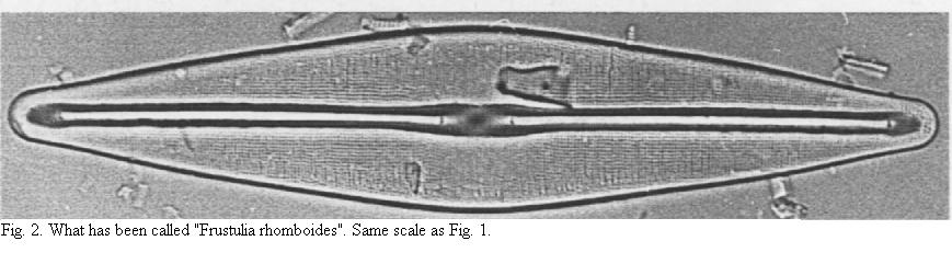 If you suspect that something went wrong in the identification of a species, taxonomy can become a thrilling detective story. It starts with a lot of pondering and careful literature research and has to end up with searching for and examining the type. I can well remember the first time I lay my hands on one, an irreplaceable slide from 1853. It scared the hell out of me and I put a pillow on the bench to prevent breaking it…In a lovely bit of sleuthing, two redoubtable taxonomists, Lange-Bertalot and Jahn examined Frustulia rhomboides. Ehrenberg described “Navicula rhomboides”, which de Toni transferred to the genus Frustulia, so Lange-Bertalot and Jahn dug up Ehrenberg’s original stuff of that diatom and for the first time in about 150 years (!) actually looked at it. The result was shattering: although Ehrenberg’s preparation (it’s not a slide but a sort of cell) does not permit good imaging, you need not be a specialist to see that his diatom (Fig. 1) is not in any way similar to what we now call Frustulia rhomboides (Fig. 2). Lange-Bertalot and Jahn showed that everybody had uncritically copied previous writers. I have found similar such cases and if you have a slightly iconoclastic streak, I can assure you it’s really cool if you can prove that authorities have goofed. The everyday equivalent would be that seagrasses have been claimed to grow on Scottish crags (spurious ecology) and heffalumps are said to roam Flanders’ Fields (spurious biogeography). The correct name is now Frustulia saxonica Rabenhorst.
