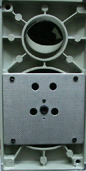 The left picture shows the underneath of a typical older Biolam stand using the large plastic dial method for focusing. Remove the four screws.