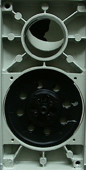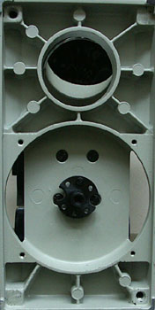 The fixed block [holding the stage] and the limb of the Biolam has good quality dovetail section solid brass movements. When applying the new greases it is essential to remove any traces of the old hardened grease from the dovetails, this is best achieved by complete disassembly of the parts. There are guiding pins which centre the main parts so re-assembly shouldn't be a problem. With the parts all separated you are left with easily cleanable brass surfaces rather than trying to squeeze cloth or cotton buds into the dovetails, some of the grease may have become so hard that a sharp knife has to be used to scrape off the deposits. Hidden within the coarse focus limb are some cogs that mesh with the main focus gear these can be accessed by removing two large screws behind the main focus brass slider one of which can be seen at the top of Fig 5. above - this allows the complete focusing block to be removed. From past experience these cogs are usually stuffed with thick horrible grease but if the coarse focus feels OK without undue stiffness or lumpiness then you can probably leave these alone. The tensioning of the coarse focus can be changed by counter-rotating the large plastic focus controls but you must do this by grabbing and rotating both controls at the same time.