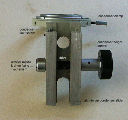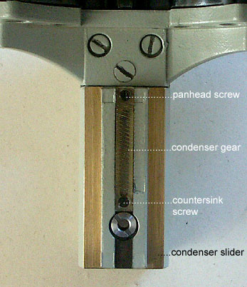 With the base removed you can simply wind down the condenser holder shown above to its lowest position using the condenser height control and then slide it off from the brass dovetail. You can adjust the left hand inner tension adjust screw for the best compromise between 'play' and freedom of movement, a similar system can also found in many other microscopes such as Zeiss. The outer clamping screw which prevents the tension adjuster from moving after adjustment normally has two small slots in the head. LOMO included a special tool for adjsting this in microscopes bought new. If not available, I have found needle point pliers sufficient for loosening or tightening these.