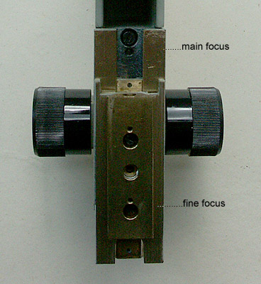First remove the thrust plate for the fine focus [held by two short screws] just below the stage at the back and remove the spring. The spring prevents slack in the fine focus when moving in the up or down direction.