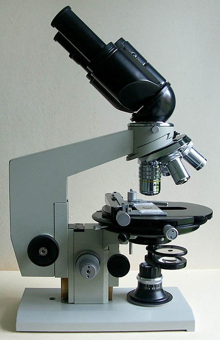 For some time the Russian Biolam [also sold under the Bresser name] has used a large plastic dial residing in the base to adjust the fine focus, this method goes back a number of years but is found on all the current range. I can't say I like this method of focusing, although it is precise I have found I need two hands to adjust the dial - it being a little stiff on my sample due to the action of a large spring pushing down on the thrust pin. Some years ago LOMO used this method of focusing together with other models using conventional fine focus controls placed either side of the limb, if you are tempted buying a second hand Biolam I suggest you might prefer the light action but weighted feel of these graduated solid aluminium fine focus controls although the internal method of focusing is similar in both models. I recently purchased one of these stands with condenser, angled eyepiece tube and eyepiece on eBay [see Fig 11.] and after a good clean and application of fresh lubricants it works a treat and at present has become my main microscope.