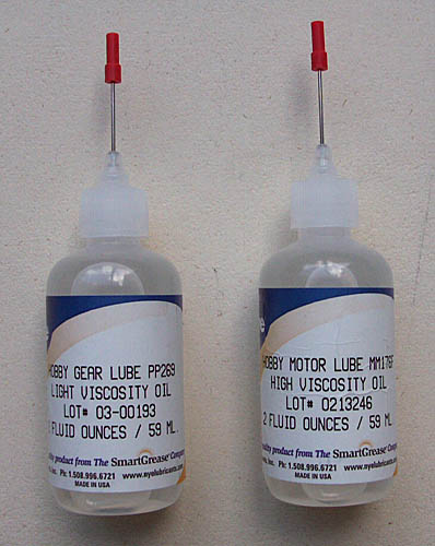 Here is a close-up of the two bottles of oil in the hobby kit and on the right the small tubes of grease. Note the left tube [Nyogel 795A] in the right hand picture was purchased separately and is a higher viscosity grease suitable for the larger moving parts found on your microscope like the coarse focus sliders.