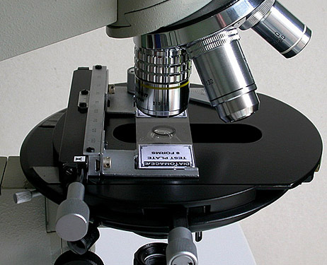 Note: many Biolam rotating and fixed stages are made from high density plastic - I don't recommend spraying these but if the finish is looking poor try first thoroughly cleaning with soapy water after removing the X-Y stage controls and the stage from the microscope, you can be quite forceful here, I use a small stiff-bristled hand brush and really put some pressure on, then let it dry off. Apply a little ARMOR ALL on a cloth and buff in, keep repeating until a nice black lustre returns, then give a final wipe with a dry cloth. ARMOR ALL is also available from Halfords stores and is used as a plastic and rubber restorer for cars etc and has worked very well on both Zeiss matt metal stages and Biolam plastic stages, make sure no liquid residues are left on the stage as it has quite a greasy texture.