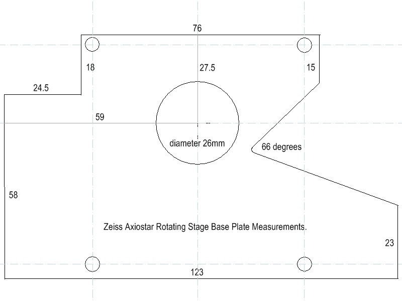 On the left, rotating stage base measurements for my Axiostar, all dimensions in mm, this is a good starting point but you may have your preferences and improve on my design. Click on 'base' image for a larger version, the right schematic is for illustration purposes, the amount of holes and their size is of personal preference but drilling them too close together or large can cause the Perspex to shatter or crack unpredictably, the final connecting of holes is best done with a needle file.