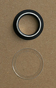 You can just see at the left hand cut-out the grey slip ring made from a very thin plastic sheet found in some A4 file dividers but any similar plastic sheet will do provided it allows free rotation and provides about 0.5mm height clearance from the CD to the base preventing scuffing. The aluminium ring can be seen forming the bearing this came from a standard 23mm eyepiece where sometimes you will find them to raise the eyepiece in the eyepiece tube about 5mm but this can be anything similar to hand and the diameter is not critical since you can drill the CD to take a quite large hole if needed. A ring that is a good fit in the original CD hole is a good choice since this is already accurately centered but I could not find anything suitable however the diameter is governed by the condenser design; you must have a hole large enough to let all the light from the condenser through for your lowest power objective otherwise it will act like a light stop.