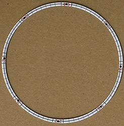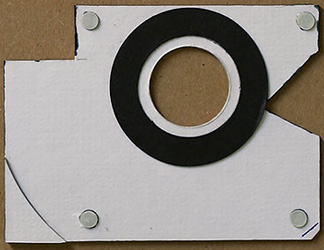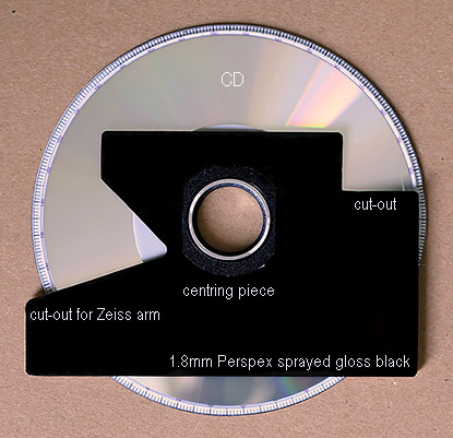 On the right, the prototype circular scale for the rotating stage drawn with Rotring drafting pens and Letraset for the figures this is based on paper stuck to thin card and this was just laid onto the felted CD surface not attached to the edge. On the left, part of the prototype base plate made from 1.6mm thick card minus the metal ring for the bearing assembly which is in use on the later version, this is where all the main problems and fine tuning of the design were carried out before moving onto cutting the Perspex [or material of choice]. However you don't have to use this thick card for your template I actually used a working prototype for a while to check the viability of the design before moving onto a Perspex version. Cardboard does not have the stability needed for continuous use and warps under different temperatures and humidity. The black card ring supported the center part of the CD and the grey roundels prevent rocking whilst turning by hand these are also used on the final version they are made from 0.5mm thick card using a paper punch and are topped with very thin plastic made the same way to prevent friction whilst turning.