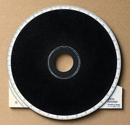 The CD based rotating section just clears the mechanical stage control, this is achieved by slip ring[s] placed beneath the CD and the choice of thickness of Perspex which roughly matches the aluminium Zeiss stage control, minimal height of the assembly was a high priority to achieve the best stability from the lightweight construction and minimum light fall-off from the condenser and since the field iris cannot be focused by the condenser this is left wide open with minimal effect on image quality at low powers whilst the condenser iris is adjusted for best contrast which for the A-Plan objectives is about 90-95% full aperture using brightfield or crossed-polars. The condenser is racked to its highest point whilst the base is held in place by cut-outs and the powerful sprung arm on the Zeiss. For a guide of thickness there is a slide under observation on the stage and note this picture is taken with the 360 degree scale removed.