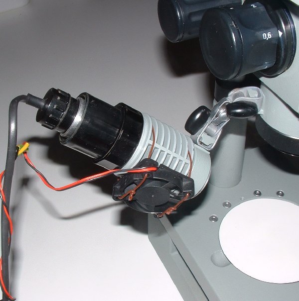 I use a bulky Russian made stereo-microscope to examine plant material and bumblebees under incident illumination. The low voltage tungsten lamp supplied gives a very uneven spread of light. After a short period of use the metal lamp housing becomes hot resulting in burned fingers. To alleviate this I have fitted a 40mm fan which blows cold air over the housing, Figure 1. This limits the rise in temperature to a few degrees. But it requires a separate low voltage power supply and the extra lead further restricts the circular travel of the lamp around the optical axis of the microscope. Being able to shift the position of the shadows is a useful aid in making correct identification of the material under the microscope.