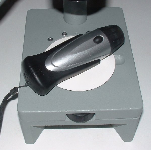 I noticed that Lidl supermarkets were selling hand torches with four and five LEDs for £4.99. A five LED torch is shown in Figure 2 sitting on the stage of the microscope. It just fits in the metal ring of the microscope which previously held the tungsten lamp, Figure 3.