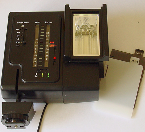 include: - A good range of power settings, this has six - from Full to 1/32 (set with slider far left in photo). - A slim profile and angled head so gun can lie flat with head pointing up (or a model with this as part of body if a slim profile). The SunPak 2400 is 5 cm high as shown with filter attachment. - Ideally a filter attachment and filters should be still available. The neutral density ND2 and ND4 filters and the 21/24 mm and 28 mm lens diffusers supplied extend the gun's versatility. Depending on flash head design and microscope condenser a diffuser may be needed to remove residual flash screen structure. - A modern flashgun may well work if slim enough and the menus remain accessible; the flash could be left on the flash power level menu. Safety note: The trigger voltages of flashguns not dedicated to the camera or recommended by the camera maker may be too high to directly sync with the camera and could fry a consumer digicams / DSLR's electronics. Gizmos are available to safely sync such flashguns with modern cameras, the 'Wein Safesync' is one. This can be seen as the small box on the hotshoe of the D50 below.