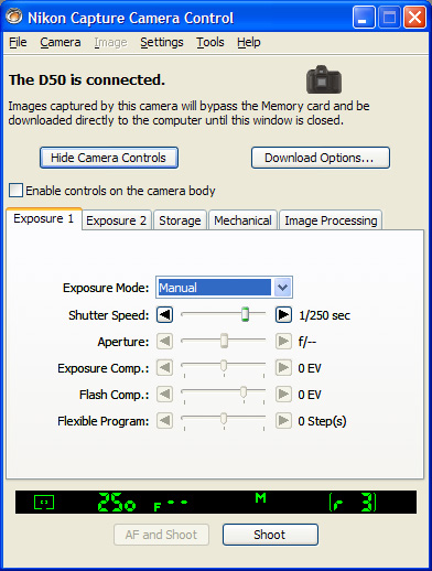 Nikon Capture control screen: The Nikon D50 doesn't meter without a lens on,