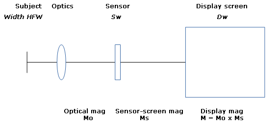 Sensor to screen mag, Ms - This magnification is inherent in any digital system because the image on the small sensor is being projected onto a potentially much larger screen. Its value is dependent on the horizontal width of both the sensor Sw and that of the display screen Dw (not the screen diagonal). Ms = Dw / Sw.