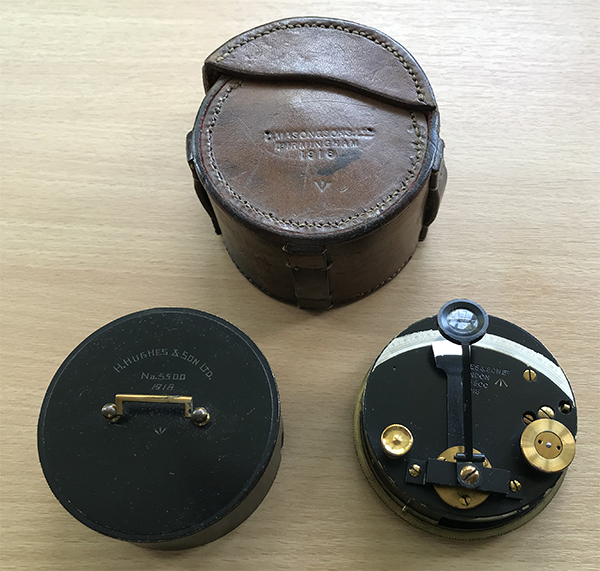 Pocket sextant 'H. Hughes & Sons Ltd. No. 5500. 1918' 71 mm diameter, 38 mm high. Leather case inscribed 'D. Mason & Sons Ltd. Birmingham. 1918. Broad arrow on item and case.