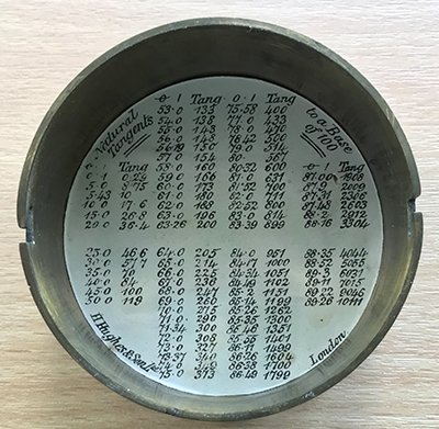 The lid has tangent tables to base 100. The sharp eyed may wonder of the inclusion of tangent values which were whole numbers to base 100. The Appendix elaborates on this.