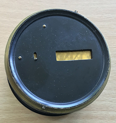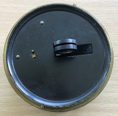 The tiny viewing aperture is at centre. The recessed sliding knob left swings across a filter over this aperture if required for sun sights.