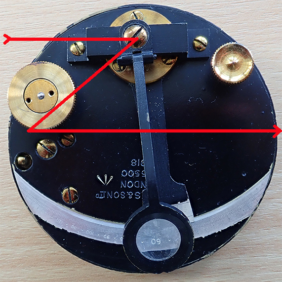 Image right: The light path is shown in red. The lens folds down for storage and height adjusted for scale focus. The index mirror which reflects the object of study is on the axis of the index arm. Its angle is adjusted with the knob left. This image is reflected to the horizon mirror at the acute angle shown and sent to the eyepiece. The smaller knob right unscrews entirely as it is a tool