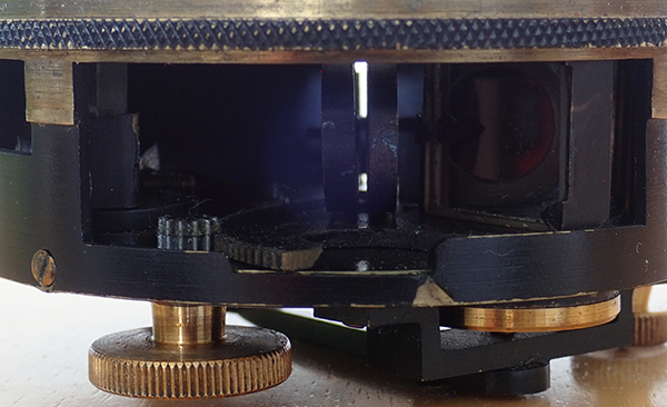 The knob and gearing to adjust the angle of the index mirror to read the altitude is shown left. The index mirror is on the right.
