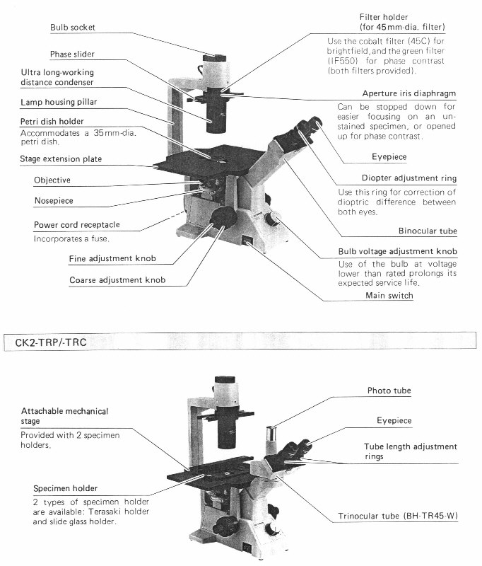I should preface my comments by the limitations on my knowledge. I am hardly an expert on the subject of inverted microscopes. My entire experience with inverted microscopes is limited to the several weeks I have spent with my CK2 (which I understand Olympus is no longer making in preference to some newer and more expensive CK models). I have not tried other inverted microscopes although I have a brochure for Olympus' much more expensive infinity corrected (IX) models.