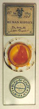 One of my slides was prepared by Dr. Thaddeus S. Up de Graff of Elmira, New York. A photograph of the slide - which is a section of human kidney - is shown right. Notice the monogram on the label, which is composed of the superimposed letters "T," "S," and "U." Also shown below is the slide as it appears at 100 magnification. In 1993, I wrote to the historical society in Elmira, New York and they sent me a wealth of biographical information related to Dr. Up de Graff. He was a remarkable person. His life was tragically short but he left his mark, as he contributed to the fields of microscopy and medicine, and he fought in the American Civil War.