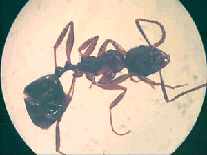 Hello! In an earlier Micscape article I described my trials with a 'JamC@m 2' web camera when used with a microscope bought for a few dollars at a yard sale. I have enclosed some additional pictures for everybody to view. The pictures include a shot of an Aphaenogaster species ant and a small wasp. I also include two un-retouched photos of the wasp from the camera i.e. with no color correction. (The quality has degraded a bit because of the high jpeg compression which I need to e-mail images on my slow modem.) But I hope they give an idea as to what to expect from the 'JamC@m 2'.