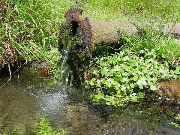Also seen, particularly along roadsides, are much shallower stone 'trays' (see photos below) and may be built into the bank of the field as shown below, or into a wall. When they are regularly fed with water as the one below is, the luxuriant growth of plants can make the low trough hard to spot.