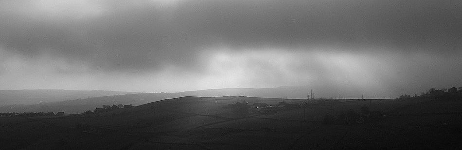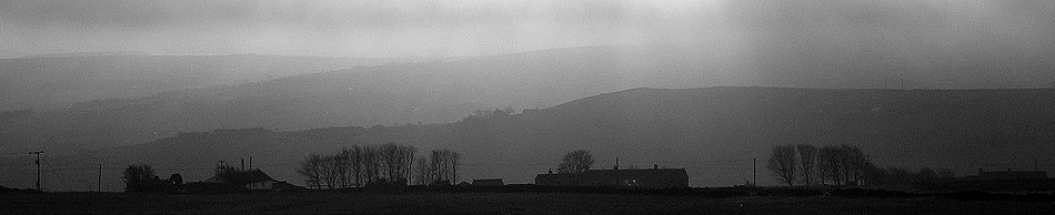 Cottages with Yorkshire hills in the distance, Canon in B&W mode.