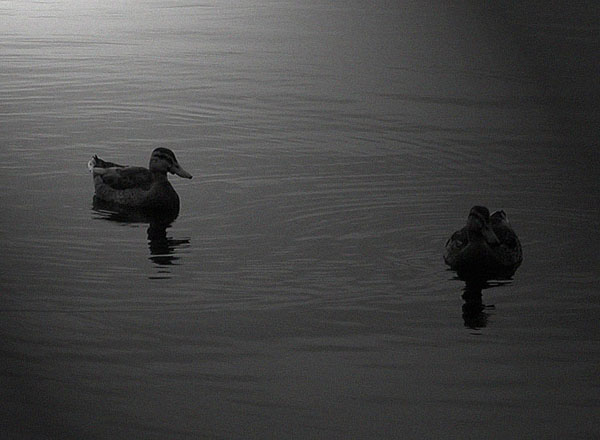Two ducks, with post editing of 4% noise added in Photoshop to give a 'fast film look' of the old days.