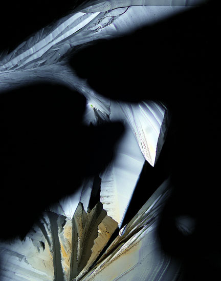 Having made bright and colourful images of polarised crystals I was searching some chemical crystal slides when I happened upon some very interesting possibilities. What was interesting for me was that I could see ‘crystal space junk’ floating out in space. With many trials at preparing slides I found a method that used tartaric acid dissolved in alcohol, temperature controlled evaporation of the alcohol, some manipulation whilst the alcohol was evaporating and partial rotation of the polarising filters. What I did manage to find out rather quickly was that I only had less than an hour to work as the crystals deteriorated.The manipulation was achieved after making some very fine dissection tools mounted on to wooden dowel for use as handles. Images were manipulated in Photoshop® in so far as making the black background completely black and some sharpening.