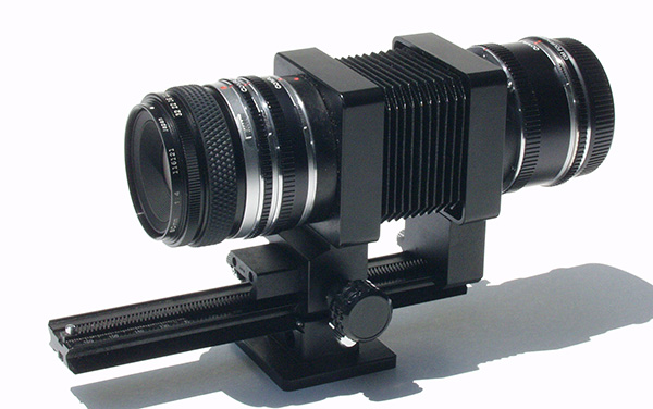 The camera is mounted on an X-Y focusing rail. The left and right movement is used to center the specimen. The front to back movement is used to establish enlargement and focus. The bellows is a Pentax screw mount bellows adapted to the Olympus Four-Thirds Standard with an MF-1 OM Adapter. I supplement the bellows extension with Pentax extension tubes.