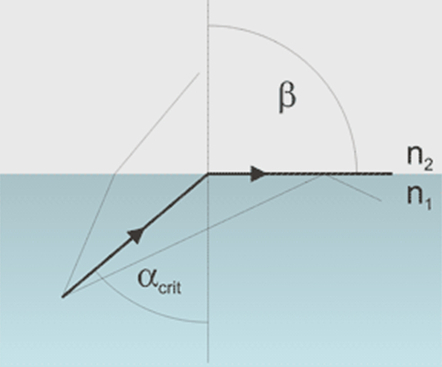 Critical angle is the incident angle at which light - instead of getting to the other side of phase boundary - gets refracted in such a way that it becomes parallel to the phase boundary surface. For smaller incident angles rays get through the boundary, for larger they get reflected back. |