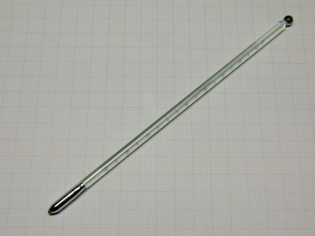 | This type of laboratory thermometers are quite accurate, each individually calibrated by engraving graduation markings on the thermometer's outer surface, 10ºC scale is over 15 mm in length, thus the 0.5ºC division is equal to or larger than 0.75 mm of the scale length, e.g. width of the graduation marks on the thermometer scale is 0.12 mm. Measurement error is less than 0.2ºC at any part of the scale guaranteed by the manufacturer, each thermometer is packed accompanied with a certificate and calibration listing. |