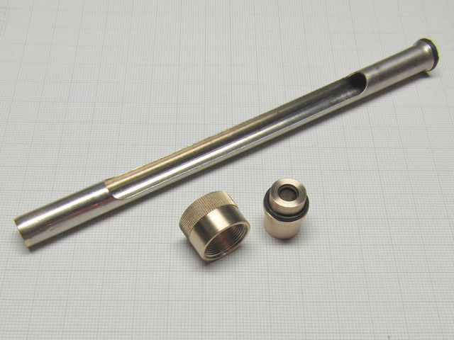 | To achieve water tightness I used two O-rings, thoughtfully placed at the right spots they provide a no leak mounting of the thermometer assembly as well as the elastic coupling to the thermometer without danger of braking its glass envelope. |