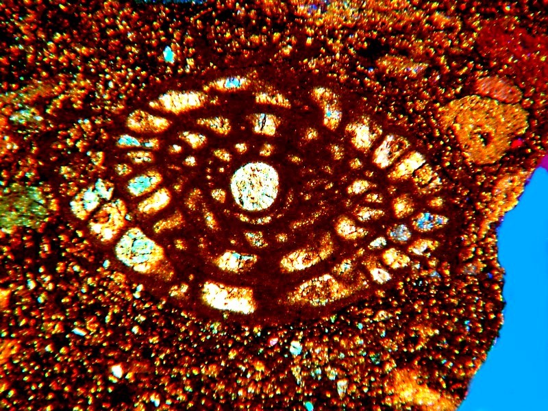 An image of a cross section of a sea urchin spine using a multivision filter. The dragonflies were attracted by the bright colors and dove into the image and got stuck in the ink.