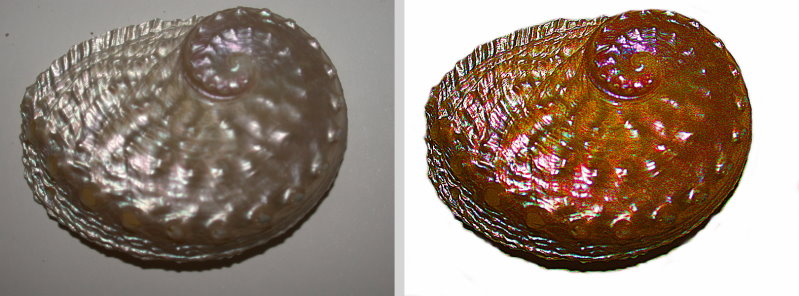 Sometimes just the right combination of modifications can enhance the image significantly. The following stitch shows the original abalone shell and the application of the focus algorithm, followed by painting in a white background, and then applying the “Color Replacement” function in the “Adjust” menu. These shells are very colorful and sometimes it is hard to preserve that and convey it in photographs. This one does, I think, do that without exaggerating or distorting the original shell’s appearance.