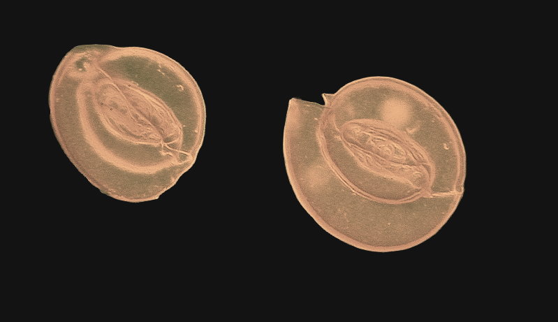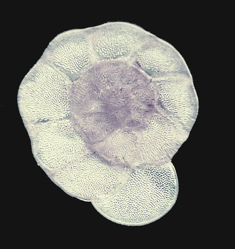 The next two are different forams photographed with the orange and blue filter and then edited to increase contrast. The small holes in the surface of the shells can be seen clearly, and the different sections around the spiral are evident in the first image, like that of a nautilus shell.