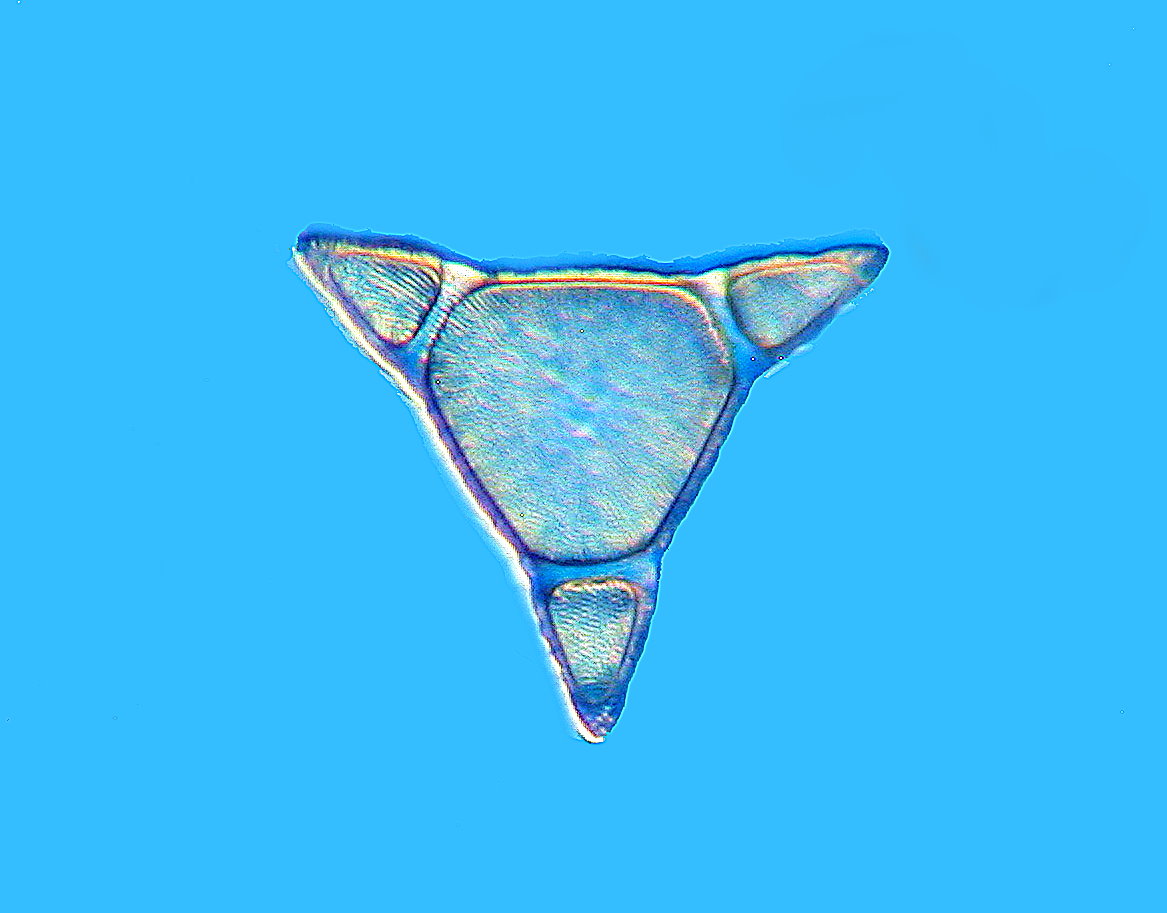 Last but not least, this is a diatom. Diatoms are types of algae that have a shell-like structure. This one is called Triceratium. It forms a prominent triangular shape. This filter used a blue filter with no center ring, making the diatom look white when photographed.