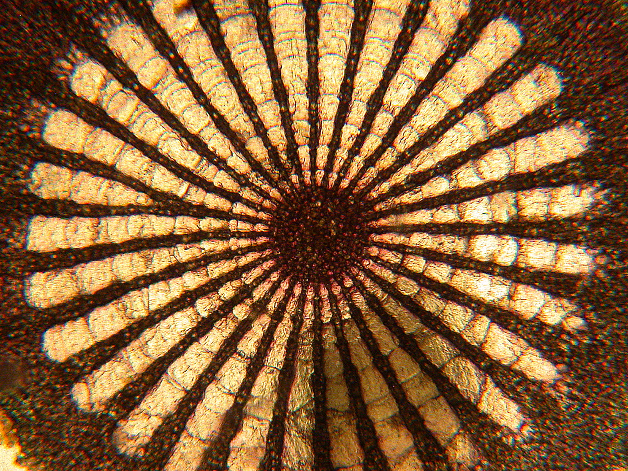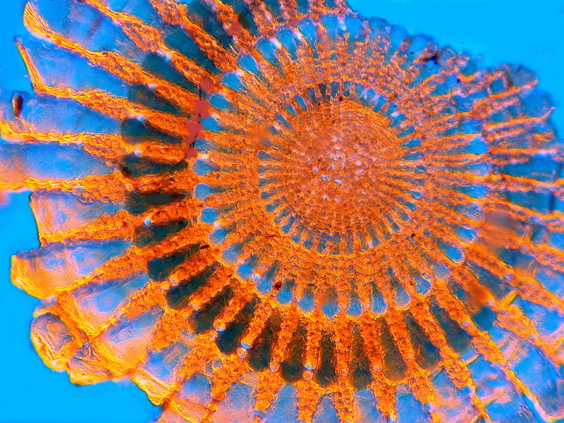 While photographing images on the microscope, I learned about a technique known as “Rheinberg Illumination”. This technique uses filters that have two parts, a ring around the edge that can be a solid color, or split into segments of different colors, and a smaller round filter in the middle of a contrasting color. When positioned correctly, the filters will cause the background to change to one of the colors, and the object being observed to be illuminated in another color. This can allow some beautiful patterns to be seen easier, and makes very colorful images that remind me of Centipede. This image is of a sea urchin spine cross-section, using an orange and blue Rheinberg filter. The image after that is the same spine, but without a filter, showing the difference the filter can make.