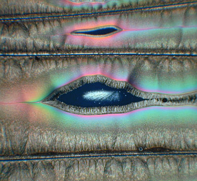 Same slide, 3.5x objective. No tonal balance tweaks as the video camera tends to give over contrasty images. A rather gritty look cf the smoother image left (and tends to lose some highlights e.g. compare white feathering detail). Colours can't be compared as critically dependent on crossed polar positions.