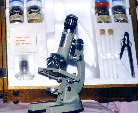 In 1965 I was saving some money to buy a Tasco 300x microscope that came in a nice wooden box with 4 slides, only one of the slides was prepared. I eventually bought this set and it became one of my first microscopes. The set that I am describing here (see Fig. 1) was way beyond the means of a 12 year old but that did not stop me from spending time looking at it in the display case at the photo shop that used to retail these sets. Eventually 32 years had to pass by and in 1997 I found the set in mint condition even with the original wrappers still covering the Styrofoam compartments. It remains the jewel in my small collection of microscopes built for kids in the middle of the 20th century. I don't like to call them toy microscopes because by today's standards many of these microscopes perform much better than a toy. So I have decided to call them student microscopes.