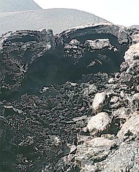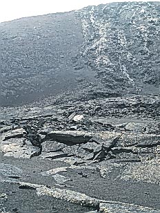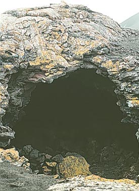 Stratified characteristic of the lava and a flat, small cave formation are obvious.
