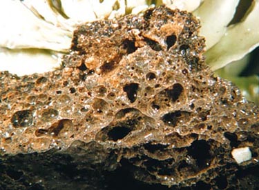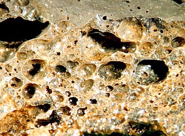 The rocks contain very many, mostly round spaces. In these voids water may condense easily and be retained for a long period of time. In both images, these small cavities are about 1 to 2 millimeter in size and pictures were obtained using a stereo-microscope.