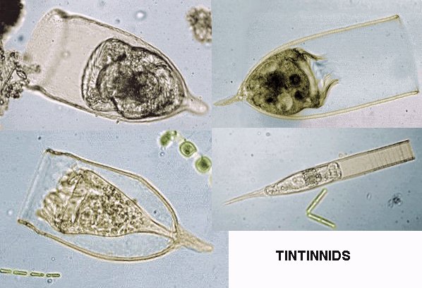 | One very elegant family are the Tintinnids which look like a French champagne glass. They are mainly marine organisms. Individuals can retract into its lorica if disturbed. When it comes out, the crown of cilia is used both for locomotion and to catch food. The three same specimens are probably from the genus Favella. Tintinnids are numerous in seawater only during the summer months. | ||||||