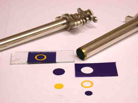 Figure 2: Preparation of the filters from Wratten gelatin material with cork borers. A finished annulus is mounted between 2 slides with Entellan.