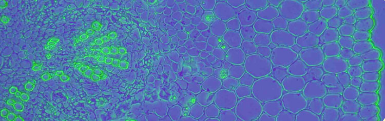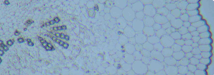 Figure 3: Transverse cryo-section of periwinkle stem (Vinca minor) in different modes of illumination. The section is mounted in glycerol and over 2 years old, therefore completely bleached. To gain some contrast, the section is illuminated with annular illumination (COL) NA0.3-0.4 (fig. 3a), proper phase contrast (fig. 3b) and colour phase contrast (fig. 3c). Objective: Wild 10/0.40 Fluotar.